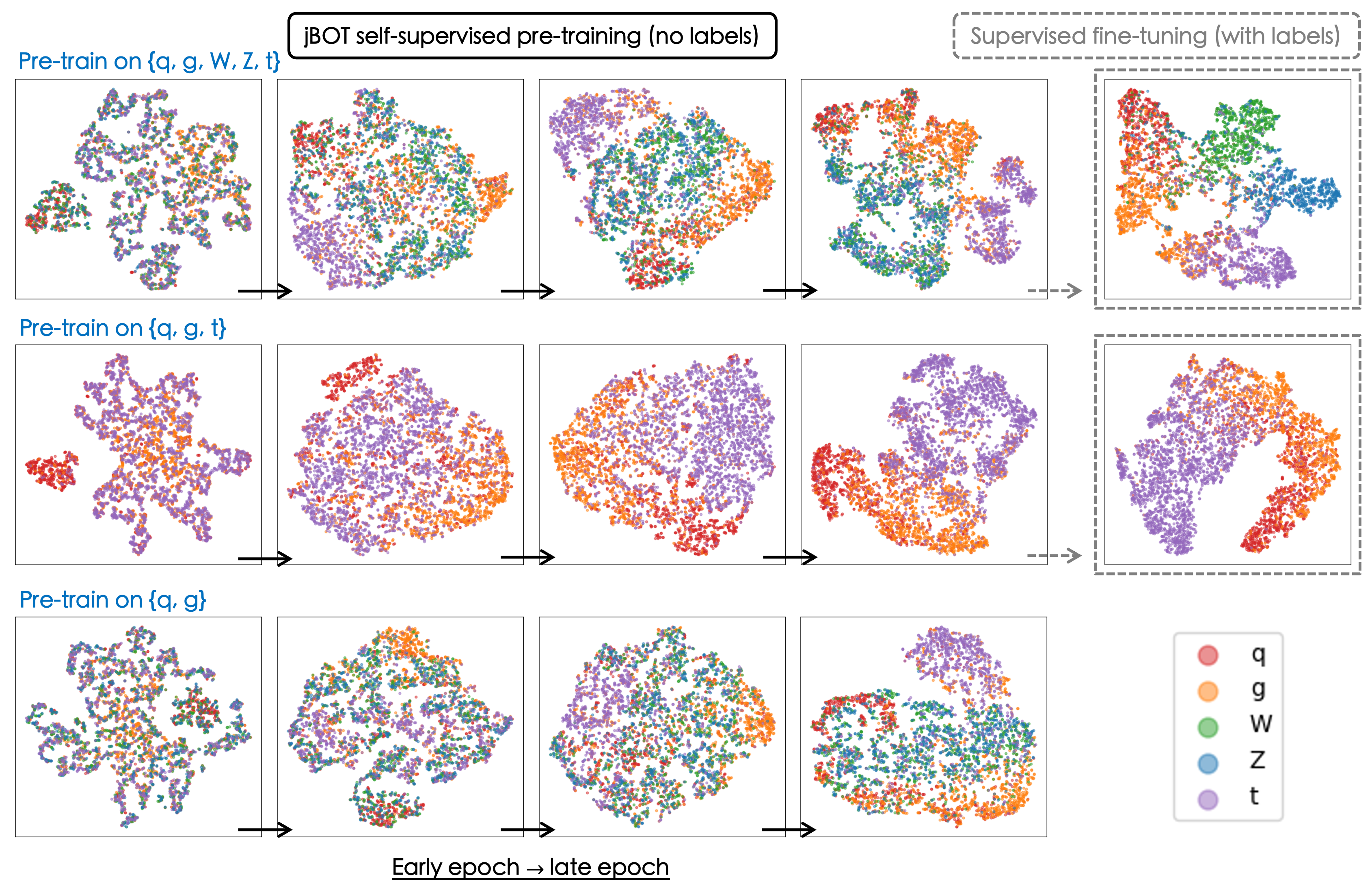 Self-supervised learning is a powerful pre-training method for learning feature representations without labels, which often capture generic underlying semantics from the data and can later be fine-tuned for downstream tasks. In this work, we introduce jBOT, a pre-training method based on self-distillation for jet data from the CERN Large Hadron Collider, which combines local particle-level distillation with global jet-level distillation to learn jet representations that support downstream tasks such as anomaly detection and classification. We observe that pre-training on unlabeled jets leads to emergent semantic class clustering in the representation space. The clustering in the frozen embedding, when pre-trained on background jets only, enables anomaly detection via simple distance-based metrics, and the learned embedding can be fine-tuned for classification with improved performance compared to supervised models trained from scratch.